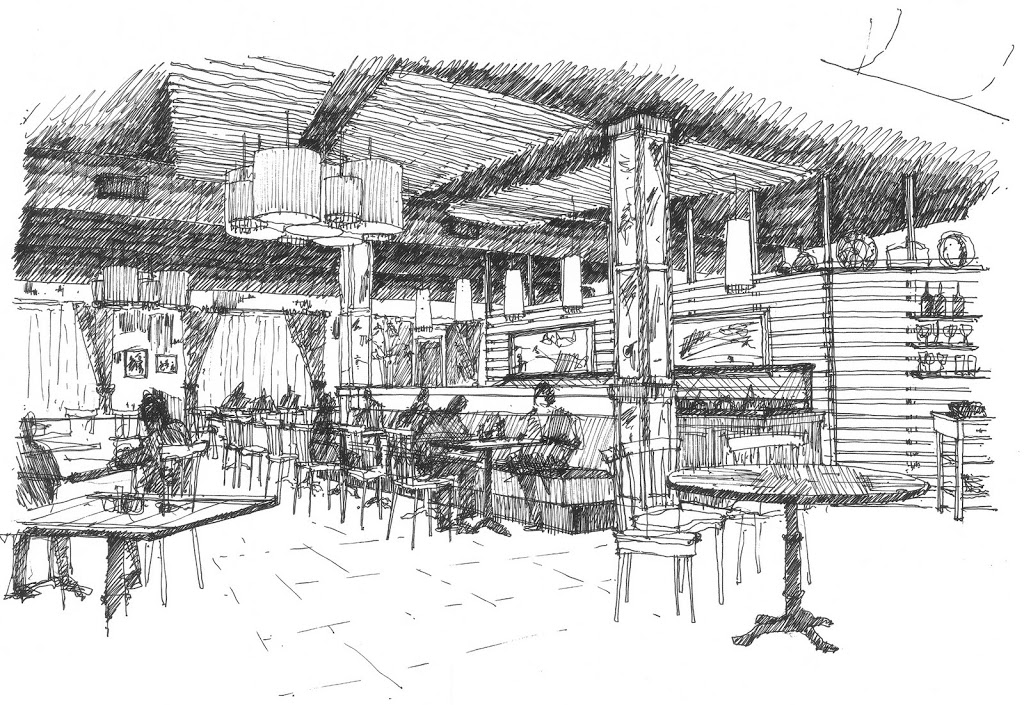 This is a conceptual sketch of the interior renovation for Saffron on Eastbay St., Charleston. The exterior renovation is complete, (except landscaping). A total interior remodel will begin after Spoleto with a grand re-opening in August. Work includes a new dining room, buffet, bathroom renovation, espresso bar and pastry display.