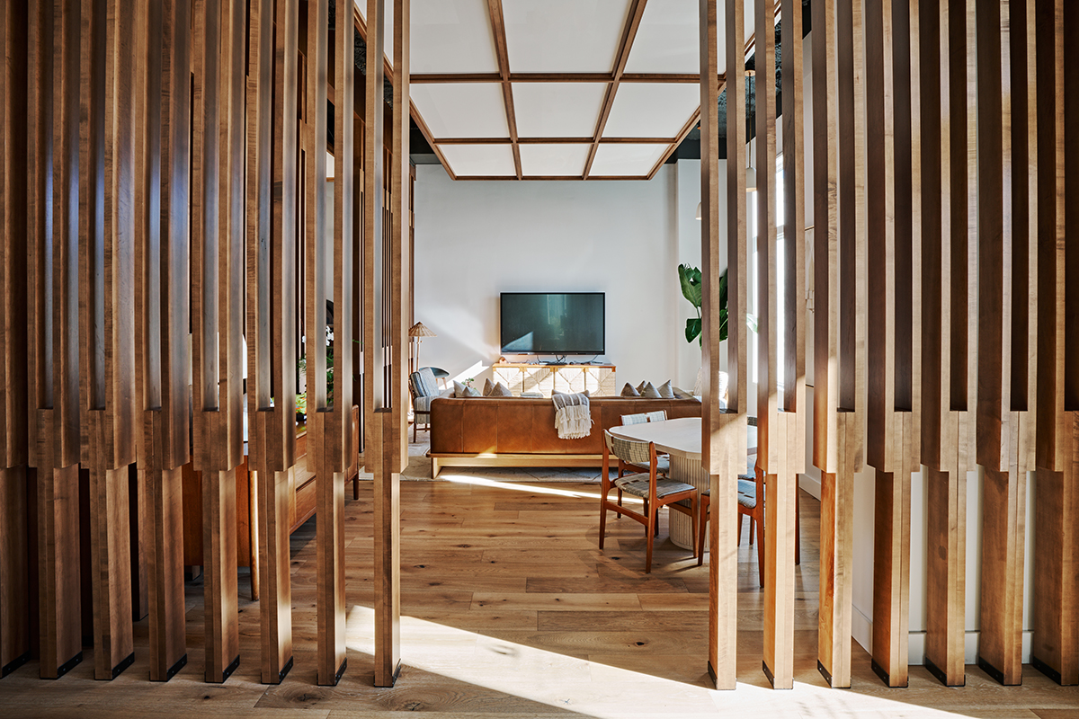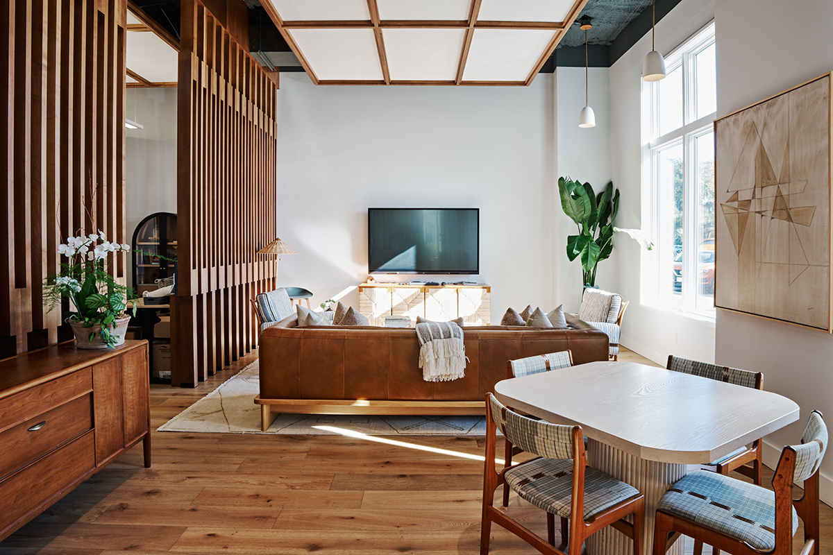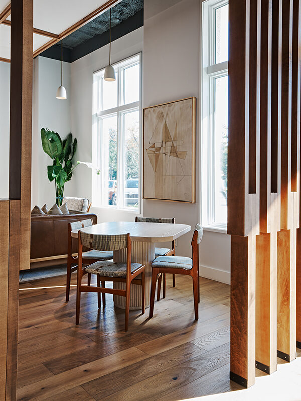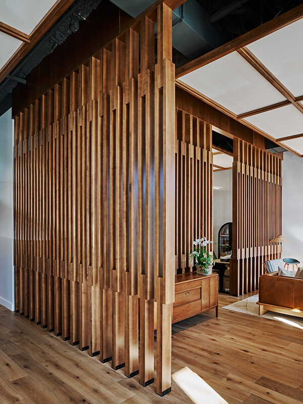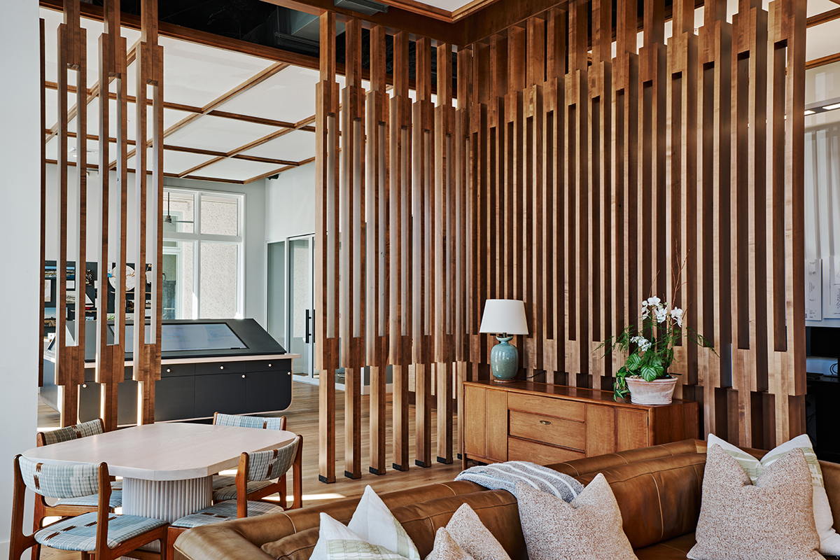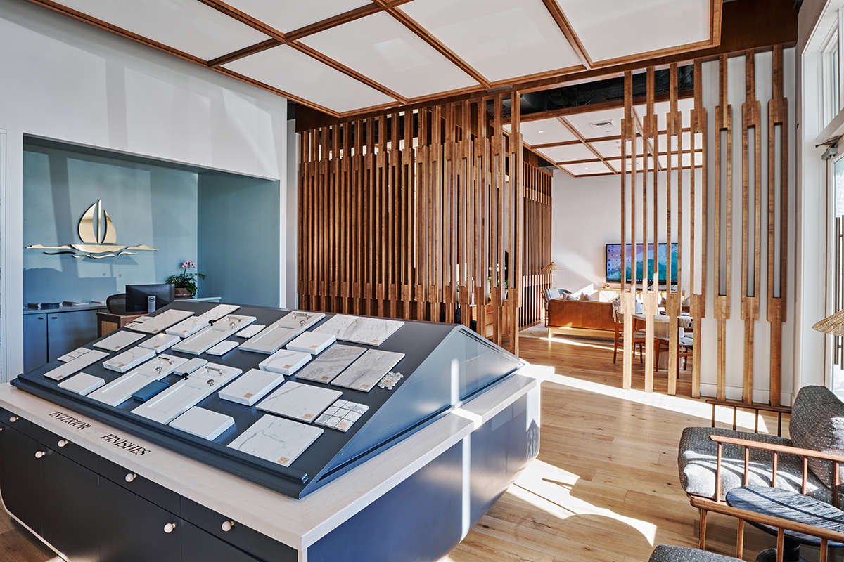 A small retail sales office and show room for a national developer, the space provides admin offices, restrooms, kitchenette, conference room and displays for potential home owners to preview the development plans and select finish and fixture packages. David Thompson Studio provided interior design services including the selection of finishes, fixtures and furniture, the design of cabinetry and custom furniture. The primary design element is a wood framed scrim or screen wall suggesting distinct areas of use without disrupting site lines and shared daylighting.