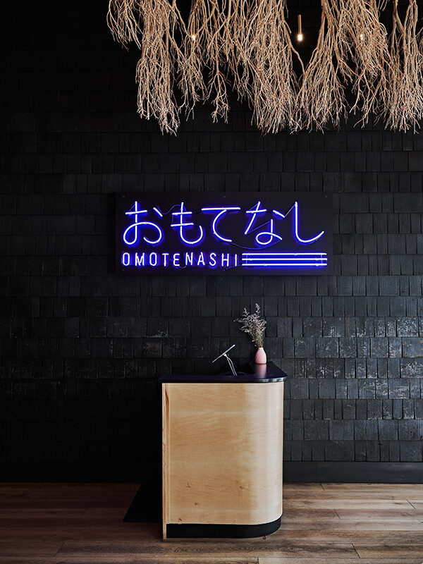 O-Ku is a sushi restaurant and bar owned by The Indigo Road Hospitality Group. Located at the urban heart of Greenville, the restaurant is fronted on one side by a prominent civic and commercial street and on the other by a public green space. The dining room is anchored by a central banquette grouping. The sushi bar and bar animate the room with activity. Custom mirrors, shou sugi ban shingles and a bespoke neon sign adorn the walls while the ceiling is focused toward an installation of manzanita branches laced with lighting.